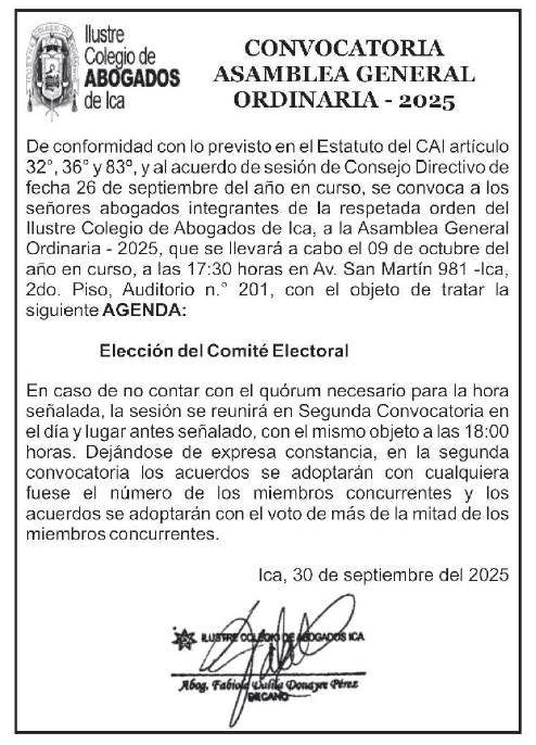 Se convoca a los señores abogados integrantes de la respetada orden del Ilustre Colegio de Abogados de Ica, a la Asamblea General Ordinaria programada para el día 09-10-2025.