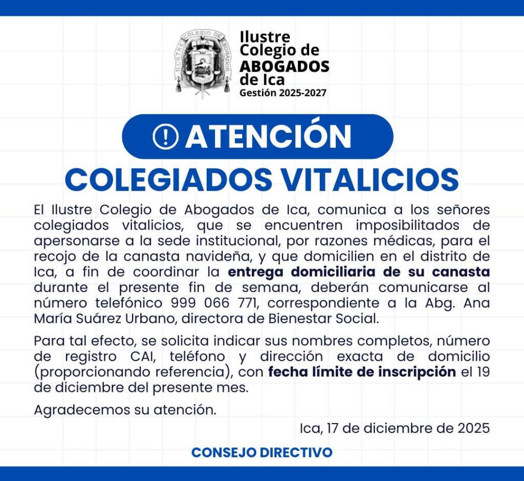 El Ilustre Colegio de Abogados de Ica, representado por el decano Abg. Óscar Diego Matta Núñez y su Consejo Directivo, saluda cordialmente a nuestros colegiados vitalicios, con motivo de la entrega domiciliaria de canastas navideñas a quienes estén imposibilitados de asistir a nuestra sede institucional.