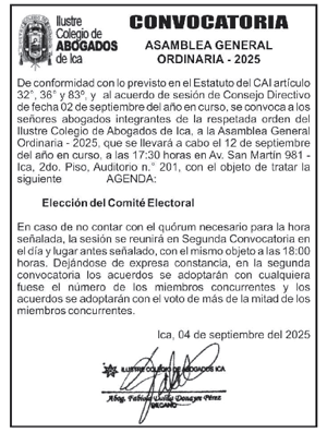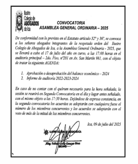 Se convoca a los señores abogados integrantes de la respetada orden del Ilustre Colegio de Abogados de Ica, a la