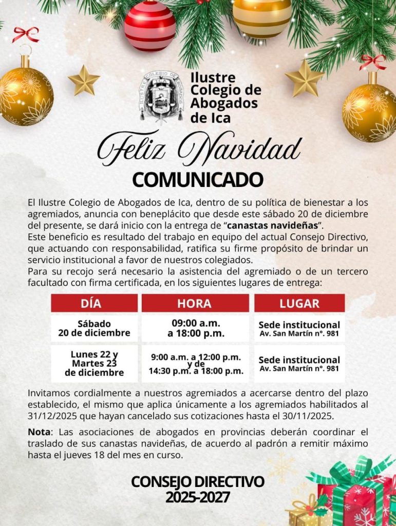 El Ilustre Colegio de Abogados de Ica, en el marco de sus actividades institucionales y con ocasi贸n de las fiestas de fin de a帽o, realiza la entrega de canastas navide帽as a sus colegiados, como muestra de reconocimiento, gratitud y confraternidad por su permanente compromiso con la orden profesional. Esta iniciativa refleja el esp铆ritu de unidad y solidaridad que caracteriza a nuestra instituci贸n, fortaleciendo los lazos que nos unen como gremio.